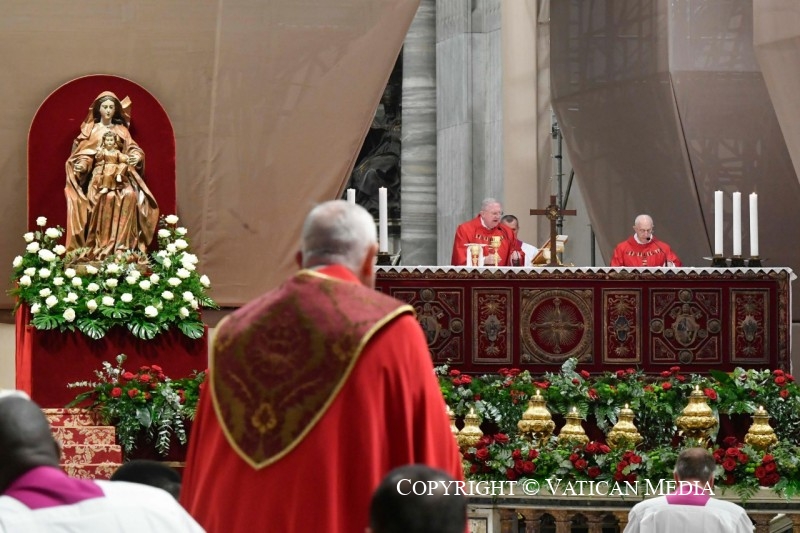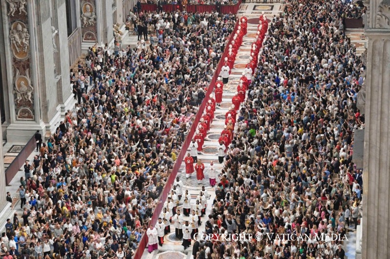 C’est également important pour nous, qui avons reçu en don l’Esprit lors du Baptême et de la Confirmation. Depuis le “cénacle” de cette Basilique, comme les Apôtres, nous sommes envoyés, aujourd’hui en particulier, pour annoncer l’Évangile à tous, en allant « toujours au-delà, non seulement du point de vue géographique mais aussi au-delà des barrières ethniques et religieuses, pour accomplir une mission réellement universelle » (Redemptoris missio, n. 25). Et grâce à l’Esprit, nous pouvons et devons le faire avec la même force et la même délicatesse.