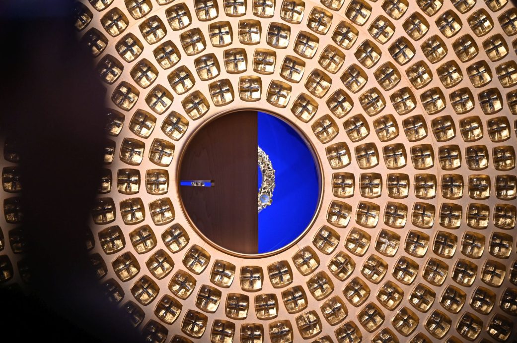 Le reliquaire se compose d’une base massive de marbre qui abrite le clou et le fragment de bois, tandis que la couronne d’épines est suspendue en son centre. Enfermé dans un cadre métallique circulaire vertical et orné de centaines de cristaux réfléchissant la lumière, le design symbolise le lien éternel entre la souffrance et le salut. Les cristaux diffusent la lumière dans toutes les directions, créant un éclat radieux et éthéré qui attire le regard (et l’âme) vers la couronne.