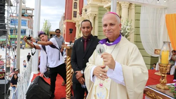 Mgr Robert Prevost saluant des fidèles du diocèse de Chiclayo au Pérou © Caritas Chiclayo