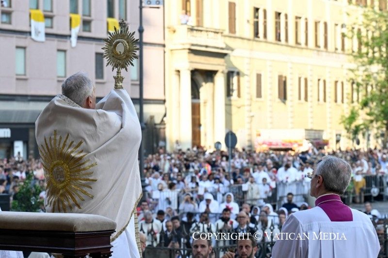 « Ensemble, pasteurs et troupeau, nous nous nourrissons du très Saint-Sacrement, nous l’adorons et nous le portons dans les rues » a ajouté le pape. « Nous portons Jésus dans le cœur de tous, lui qui implique tout le monde dans l’œuvre du salut, invitant chacun à participer à sa table. Heureux les invités qui deviennent témoins de cet amour ! »