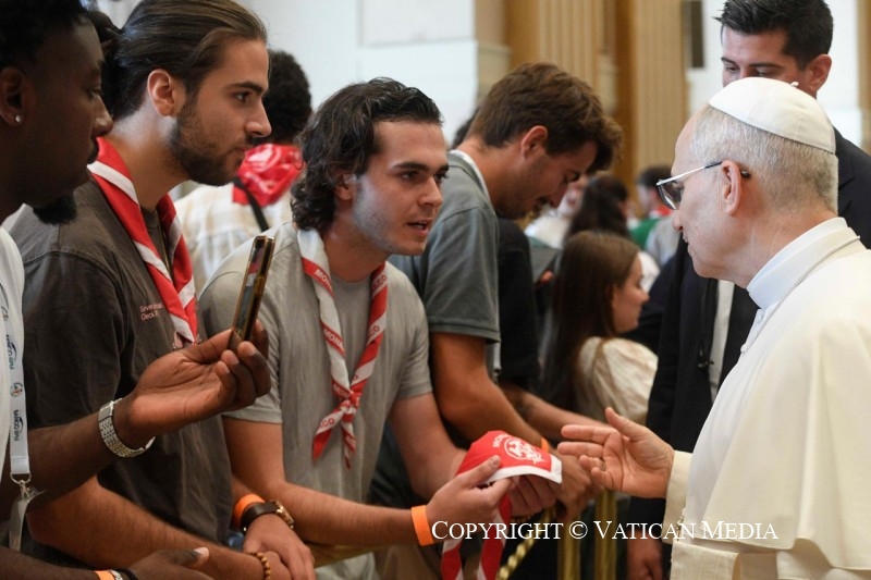 Quelle joie de voir des jeunes qui s’engagent dans la foi et veulent donner un sens à leur vie, en se laissant guider par le Christ et son Évangile ! Le baptême fait de nous des membres à part entière de la grande famille de Dieu. L’initiative vient toujours de lui et nous y répondons en faisant l’expérience de son amour qui nous sauve. Dans votre cheminement comme catéchumènes et nouveaux baptisés, chacun de vous fait une rencontre personnelle avec le Seigneur dans la communauté qui l’accueille. Nous nous reconnaissons personnellement filles et fils de Dieu par notre baptême « au nom du Père » qui nous offre l’adoption, « du Fils » qui nous fait entrer dans sa vie et sa relation à son Père, « et du Saint-Esprit », source de tout don (cf. Ga 4, 6). Saint Paul révèle l’effet essentiel du baptême, lorsqu’il écrit aux Galates : « Vous tous en effet, baptisés dans le Christ, vous avez revêtu le Christ » (3, 27).