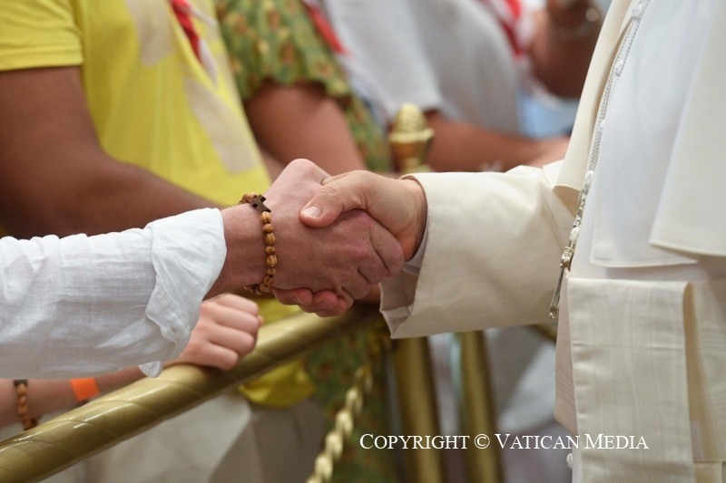Chers amis, avec l’aide et le soutien de vos pasteurs, de vos frères et sœurs aînés dans la foi, et à l’exemple des saints qui ont affronté les difficultés propres à leur époque, je vous encourage à rester connectés au Seigneur Jésus. Nous ne naissons pas chrétien, nous le devenons quand nous sommes touchés par la grâce de Dieu. Cependant ce “toucher” s’exprime à travers notre choix dûment réfléchi et par notre démarche personnelle. Sans ces exigences véritables, nous porterons l’étiquette chrétienne, mais des chrétiens de convenance, d’habitude ou de confort. Nous devenons d’authentiques chrétiens lorsque nous nous laissons personnellement toucher dans notre vie de chaque jour par la parole et le témoignage de Jésus. Au milieu de vos tribulations, des moments de solitude et d’aridité, des incompréhensions, de vos fatigues, puissent vos cœurs s’établir en lui qui est « le Chemin, la Vérité et la Vie » (Jn 14, 6), la source de toute paix, joie et amour.