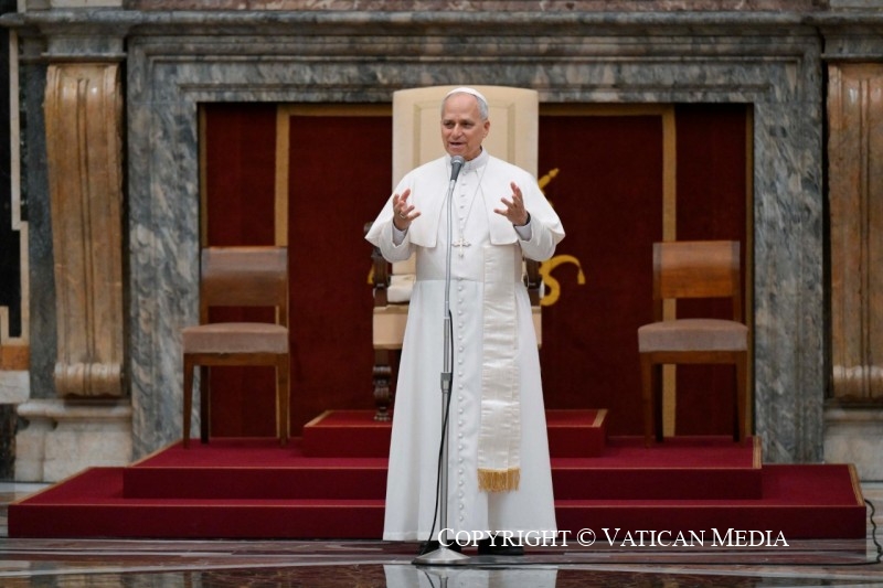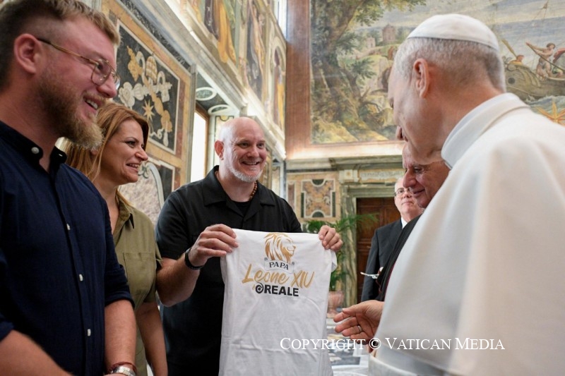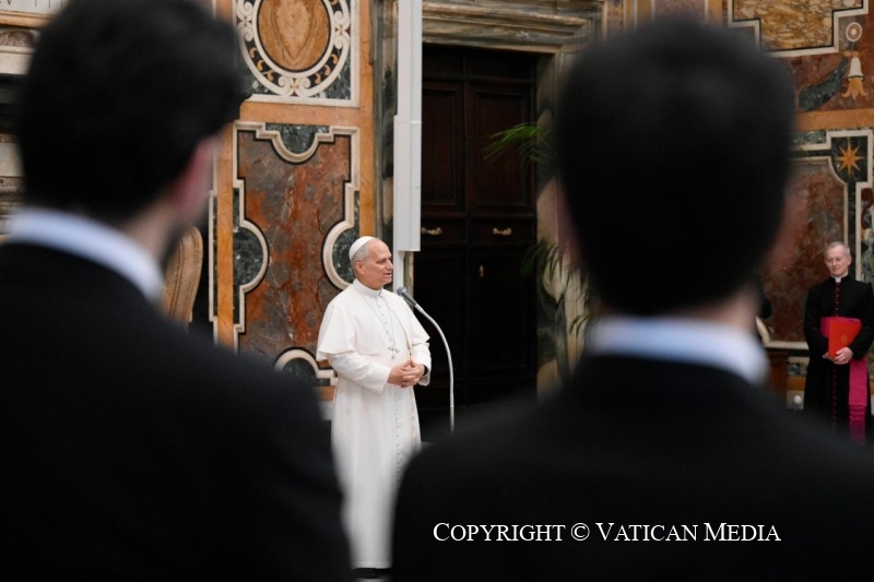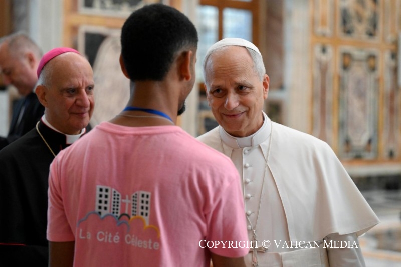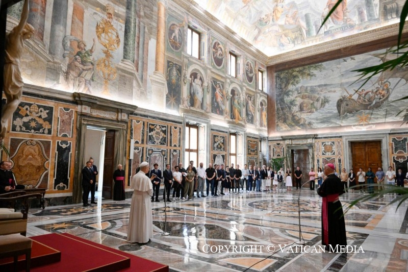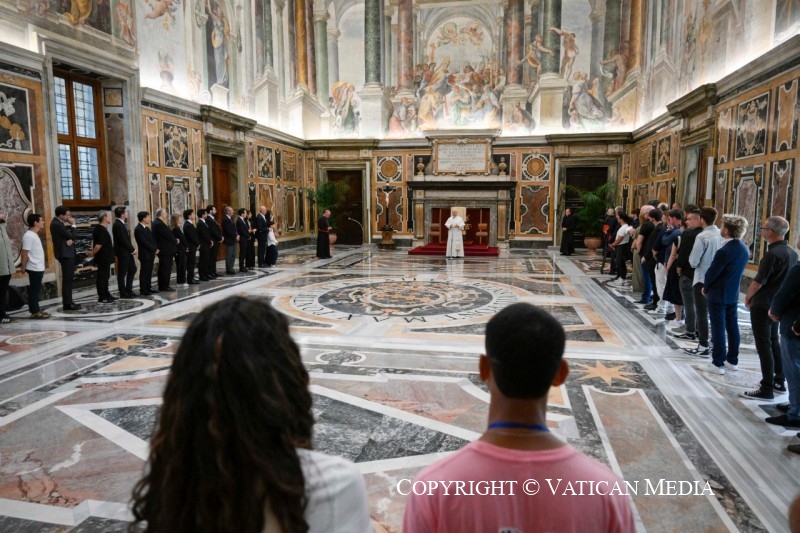 Merci ! Bonjour à tous et merci pour tant de choses. J’ai voulu avoir cette petite rencontre, disons familiale, avec vous ce matin, en sachant la beauté, l’art, la musique, tous les talents que vous offrez à ce grand public que nous avons à Rome ces jours-ci. Plus d’un demi-million, dit-on, peut-être un million de jeunes venus de nombreux pays du monde. Pour moi, c’est un privilège, une bénédiction de pouvoir participer à cette mission, à ce service, en tant qu’évêque de Rome, en tant que Saint-Père, en connaissant surtout la foi, l’enthousiasme et la joie que nous partageons et qui donnent voix à ce que nous avons dans notre cœur — et qui est surtout le désir de trouver le bonheur, la joie, l’amour ; de faire l’expérience de la foi aussi à travers les dons que le Seigneur nous a donnés : la musique, la danse et tant de formes artistiques que vous partagerez cet après-midi avec les jeunes.