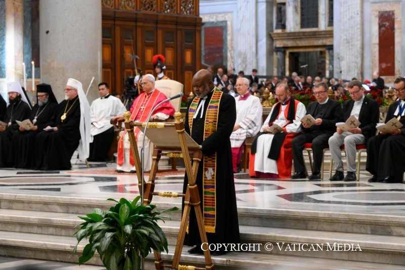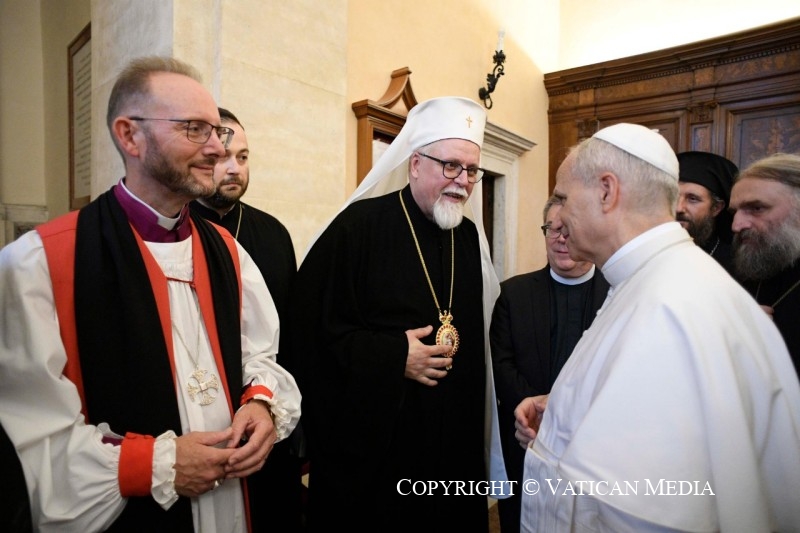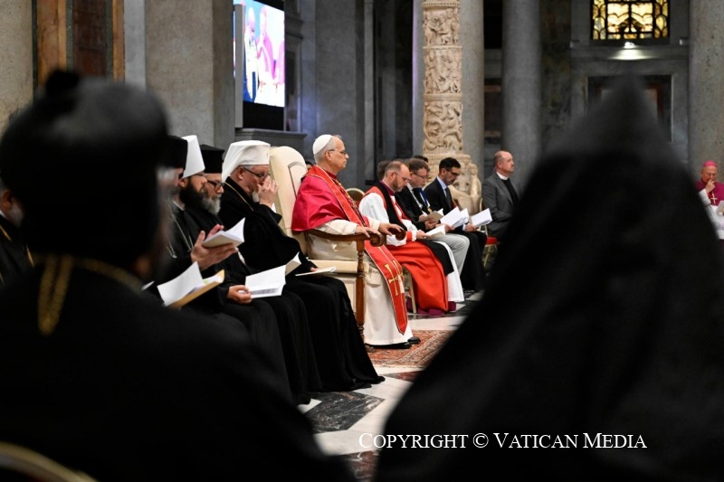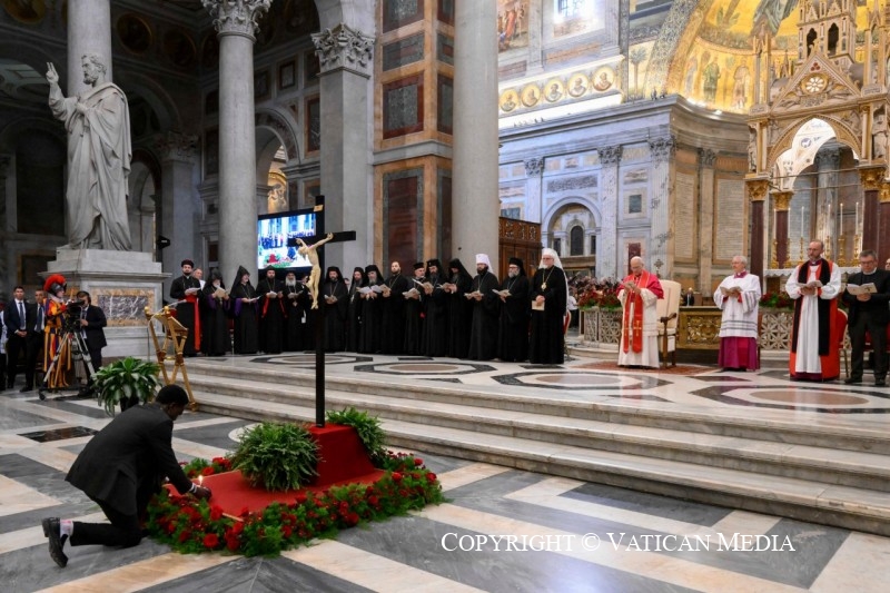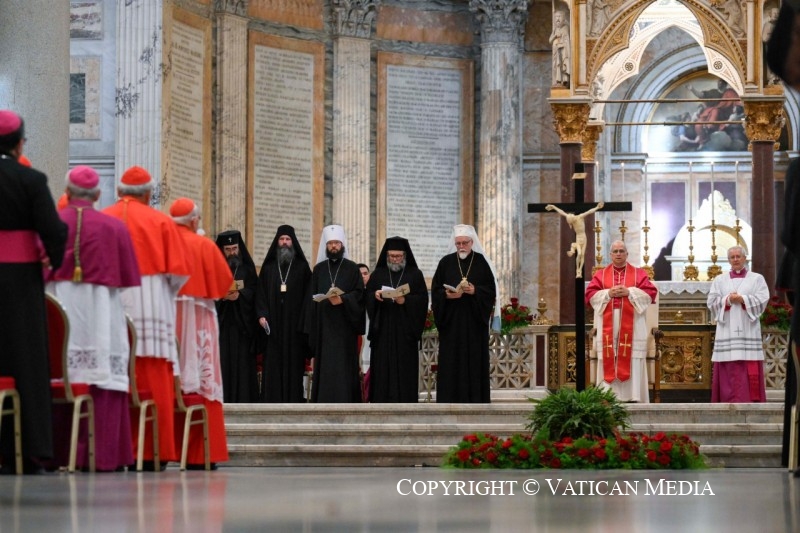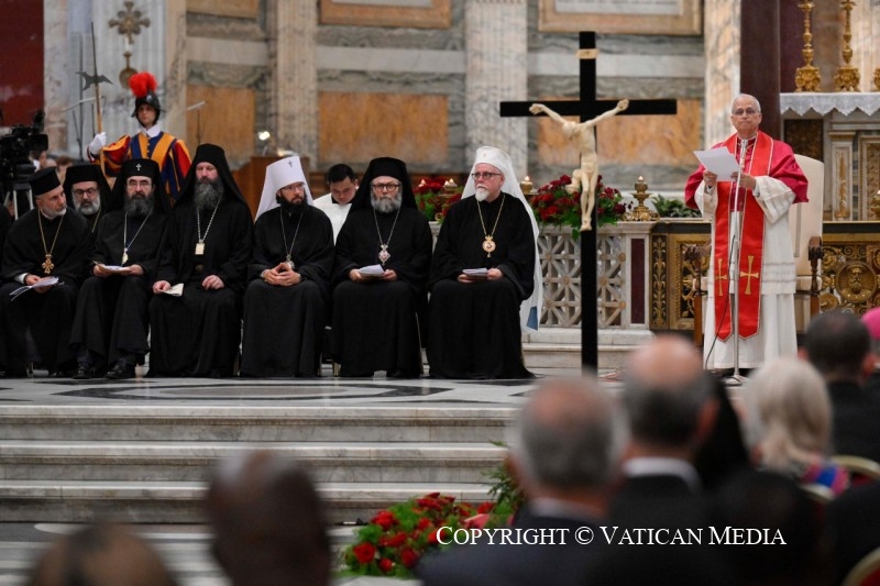 Aux pieds de la croix du Christ, notre salut, décrite comme “l’espérance des chrétiens” et la “gloire des martyrs” (cf. Vêpres de la Liturgie byzantine pour la Fête de l’Exaltation de la Croix), je salue les Représentants des Églises Orthodoxes, des Anciennes Églises Orientales, des Communions chrétiennes et des Organisations œcuméniques, que je remercie d’avoir accepté mon invitation à cette célébration. À vous tous ici présents, mon accolade de paix.