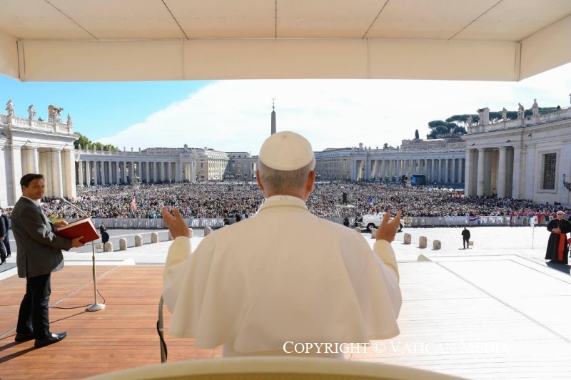 Enfin, je pense aux jeunes, aux malades et aux nouveaux mariés. Que le Christ, la Porte Sainte qui nous introduit auprès du Père, soit toujours au centre de votre vie, afin que vous soyez des témoins convaincus et joyeux de son amour.