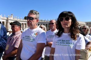 J’adresse de tout cœur mon salut à vous tous qui avez pris part à cette célébration jubilaire consacrée aux catéchistes, en particulier à ceux qui ont été institués aujourd’hui pour ce ministère. Et avec vous, je désire adresser mes meilleurs vœux de bon service aux catéchistes de toute l’Église répandue dans le monde ! Merci pour votre service à l’Église ! Prions pour eux, spécialement pour ceux qui travaillent dans des conditions de grande difficulté. Que Dieu vous bénisse tous !