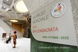 Vous vous êtes préparés à ces jours par un long chemin, dans vos pays, au sein de vos Instituts, Sociétés et Associations, au sein des diverses Conférences, inspirés par le thème : « Pèlerins d’espérance, sur le chemin de la paix ». Il existe un profond besoin d’espérance et de paix dans le cœur de chaque homme et femme de notre temps, et vous, consacrées et consacrés, voulez en être porteurs et témoins par votre vie, comme diffuseurs de concorde par la parole et l’exemple, et surtout comme des personnes qui portent en elles-mêmes, par la grâce de Dieu, l’empreinte de la réconciliation et de l’unité.