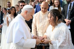 Et il est aussi le point d’arrivée de notre marche. Sans son amour, le voyage de la vie deviendrait une errance sans but, une erreur tragique sans destination. Nous sommes des créatures fragiles. L’erreur fait partie de notre humanité, c’est la blessure du péché qui nous fait tomber, abandonner, désespérer. Ressusciter, en revanche, signifie se relever et se mettre debout. Le Ressuscité nous garantit un abri sûr, il nous ramène à la maison, où nous sommes attendus, aimés, sauvés. Faire le voyage avec Lui à nos côtés signifie expérimenter que nous sommes soutenus malgré tout, désaltérés et rafraîchis dans les épreuves et les labeurs qui, comme de lourdes pierres, menacent de bloquer ou de dévier notre histoire.