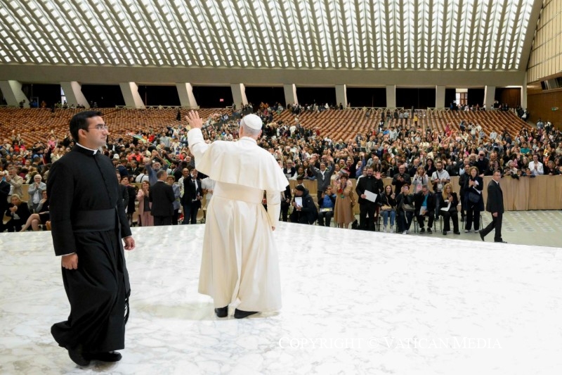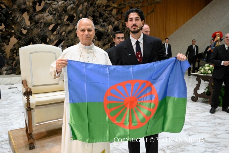Enfin, en remerciant le Dicastère pour le Service du Développement Humain Intégral et la Fondation Migrantes pour leurs grands efforts dans l’organisation de ce beau Jubilé, j’invite vous, opérateurs pastoraux auprès des Roms, Sinti et peuples itinérants, à poursuivre avec un nouvel élan les objectifs formulés par le Cinquième Congrès Mondial de la Pastorale des Tsiganes. Je pense notamment à ceux concernant l’éducation et la formation professionnelle, la pastorale de la famille et de la communauté, l’inculturation de la liturgie et de la catéchèse – y compris la question de la langue – ainsi que le dialogue œcuménique et interreligieux dans le monde des Roms, Sinti et itinérants. Enfin, je souhaite que chaque diocèse développe une pastorale adéquate dédiée aux communautés Roms, Sinti et itinérantes, pour un véritable développement humain intégral.