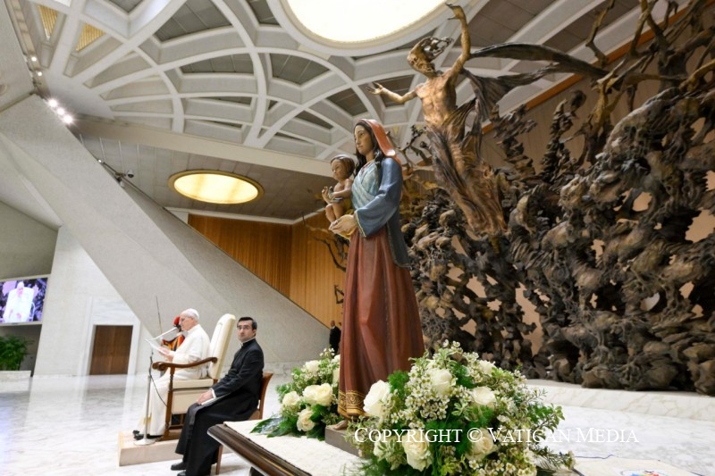 La célébration jubilaire d’aujourd’hui survient soixante ans après la première rencontre mondiale historique que le pape saint Paul VI eut avec vos communautés à Pomezia, le 26 septembre 1965. Comme témoin de cet événement, la statue de la Vierge Marie est ici aujourd’hui, elle que le Pape lui-même couronna « Reine des Roms, Sinti et Nomades ». Au cours de ces soixante années, les rencontres avec mes prédécesseurs sont devenues toujours plus fréquentes, dans des contextes variés, signe d’un dialogue vivant et d’un soin pastoral particulier pour vous, « la portion bien-aimée du peuple de Dieu en chemin ». Oui, Dieu le Père vous aime et vous bénit, et l’Église vous aime et vous bénit.