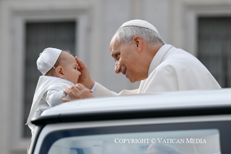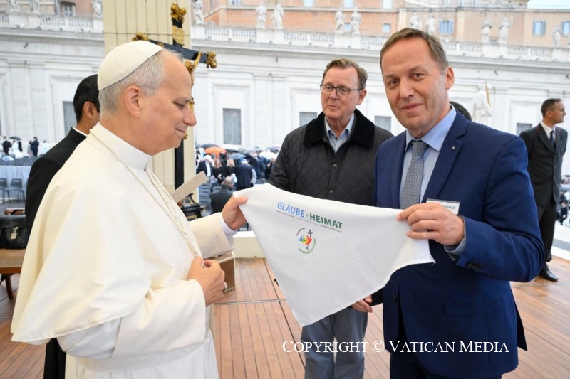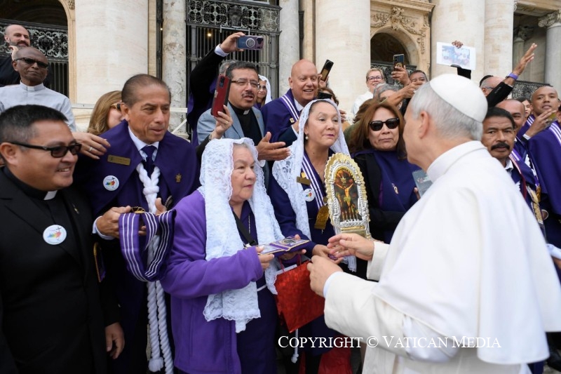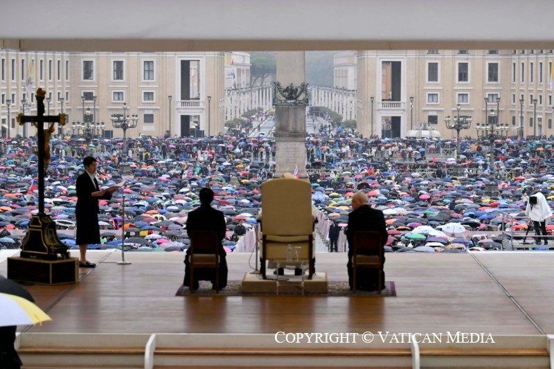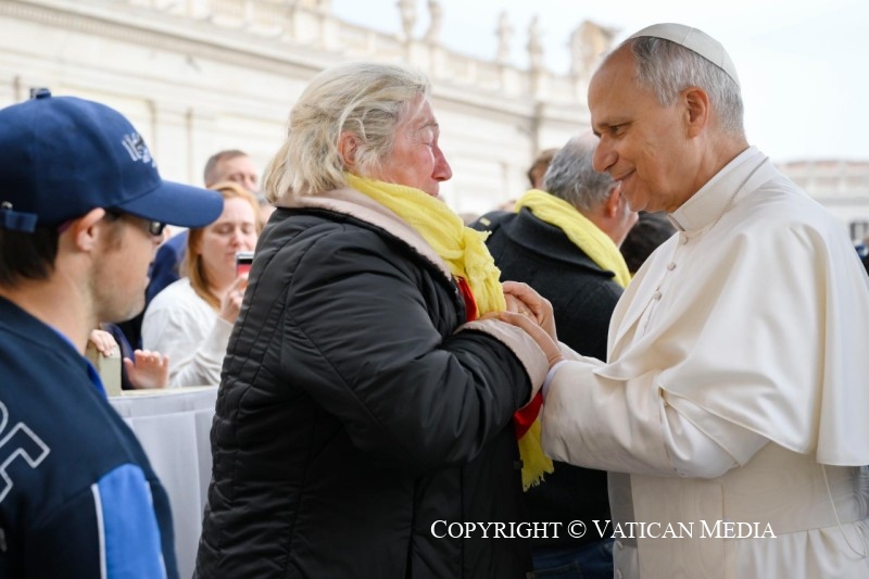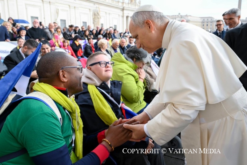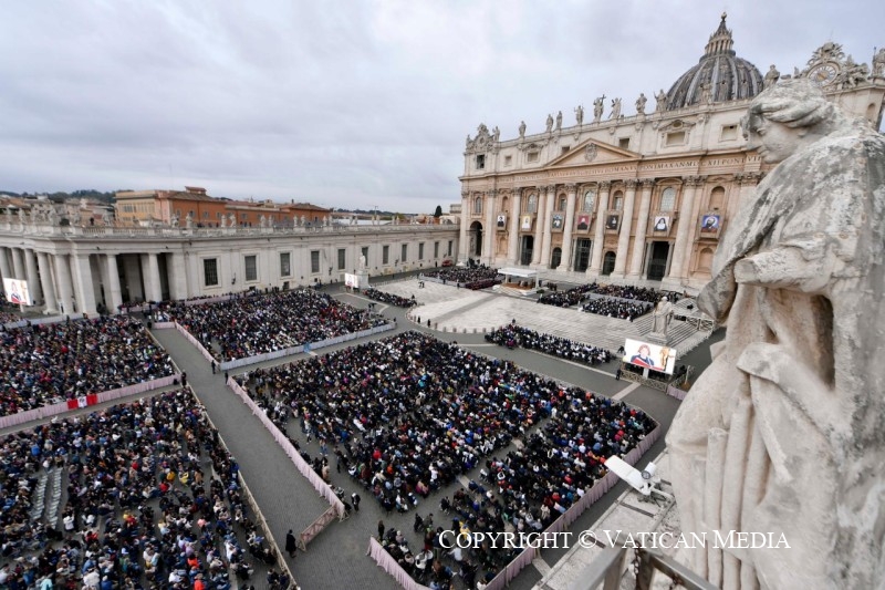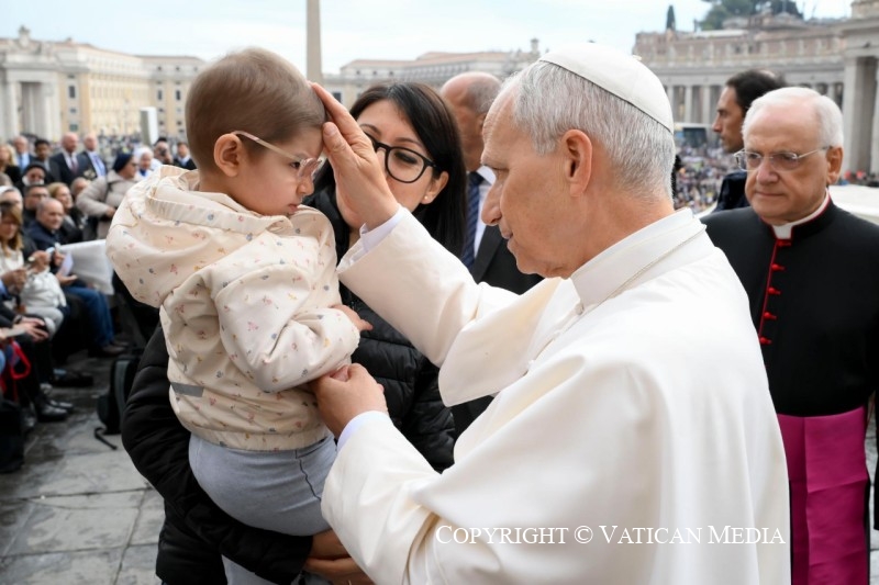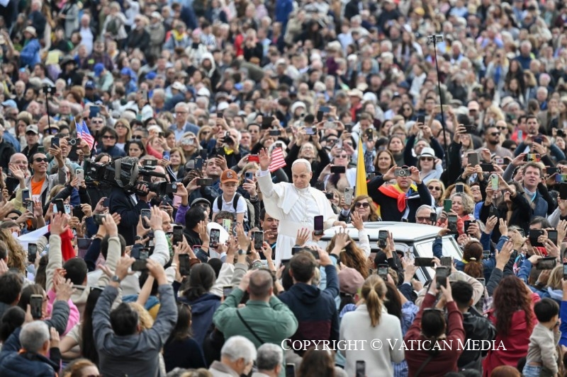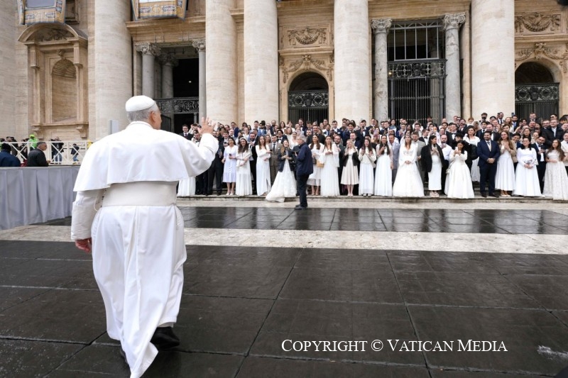 « Le Seigneur est vraiment ressuscité » (cf. v. 34). Dans cet adverbe, vraiment, s’accomplit sûrement notre histoire d’êtres humains. Ce n’est pas un hasard si c’est la salutation que les chrétiens échangent le jour de Pâques. Jésus n’est pas ressuscité avec des paroles, mais avec des faits, avec son corps qui conserve les marques de la passion, le sceau éternel de son amour pour nous. La victoire de la vie n’est pas un vain mot, mais un fait réel et concret.