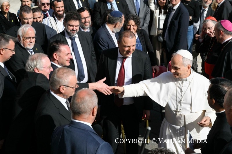 En particulier, il ne faut pas oublier que la première orientation de Nostra Aetate allait vers le monde juif, avec lequel saint Jean XXIII entendait refonder le rapport originel. Ainsi, pour la première fois dans l’histoire de l’Église, un traité doctrinal sur les racines juives du christianisme allait prendre forme, ce qui, sur le plan biblique et théologique, représentait un point de non-retour. « Le peuple du Nouveau Testament est spirituellement lié à la lignée d’Abraham. En effet, l’Église du Christ reconnaît que les prémices de sa foi et de son élection se trouvent déjà, selon le mystère divin du salut, dans les patriarches, Moïse et les prophètes » (NA, 4). Ainsi, l’Église, « consciente de l’héritage qu’elle a en commun avec les juifs, et poussée non par des motifs politiques mais par une charité religieuse évangélique, déplore les haines, les persécutions et toutes les manifestations d’antisémitisme dirigées contre les juifs en tout temps et par quiconque » (ibid.). Depuis lors, tous mes prédécesseurs ont condamné l’antisémitisme en des termes clairs. Je confirme donc moi aussi que l’Église ne tolère pas l’antisémitisme et qu’elle le combat, en raison de l’Évangile lui-même.
