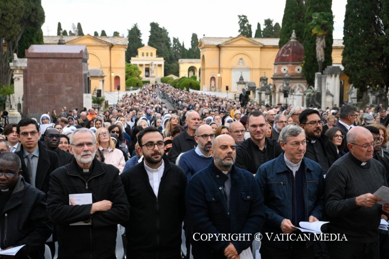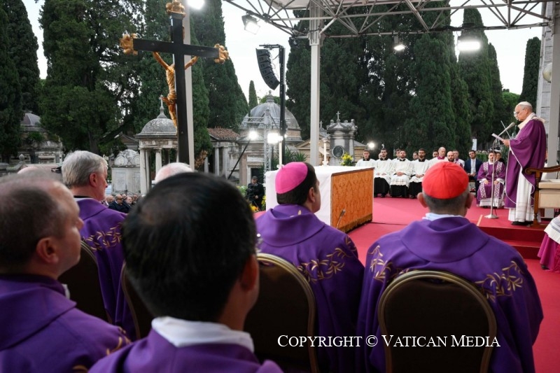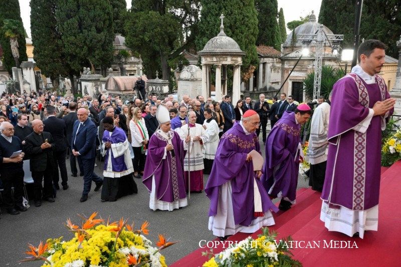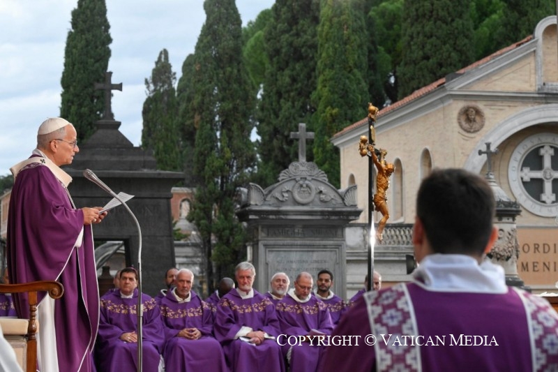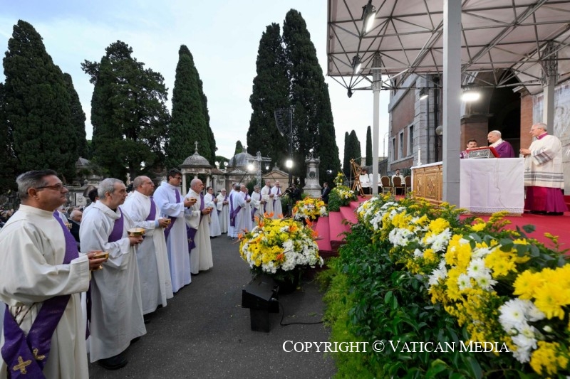 nous sommes réunis en ce lieu pour célébrer la commémoration de tous les fidèles défunts, en particulier de ceux qui sont enterrés ici et, avec une affection particulière, de nos proches. Le jour de leur mort, ils nous ont quittés, mais nous les portons toujours dans notre cœur. Et chaque jour, dans tout ce que nous vivons, ce souvenir est vivant. Souvent, quelque chose nous renvoie à eux, des images qui nous ramènent à ce que nous avons vécu avec eux. De nombreux lieux, même les parfums de nos maisons, nous parlent de ceux que nous avons aimés et qui nous ont quittés, et gardent leur souvenir vivant en nous.