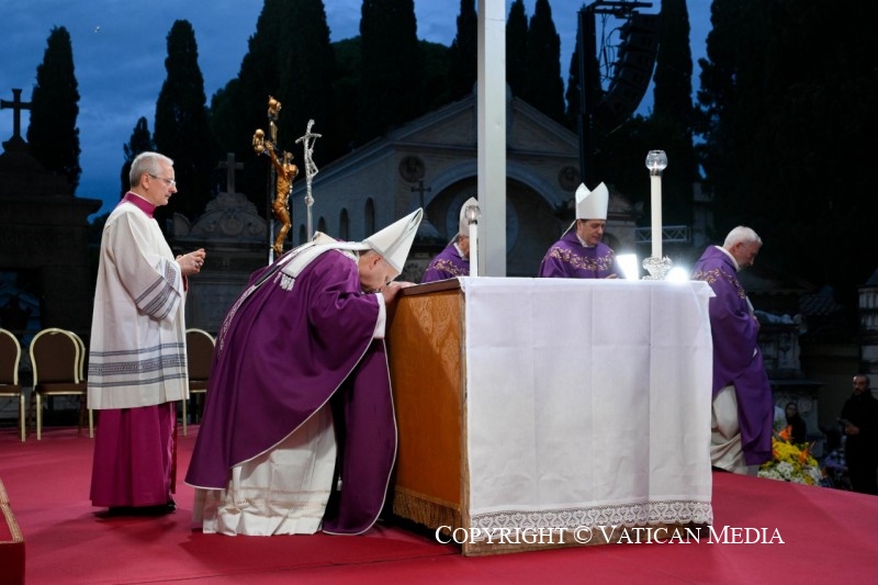 Aujourd’hui, cependant, nous ne sommes pas seulement ici pour commémorer ceux qui ont quitté ce monde. La foi chrétienne, fondée sur la Pâque du Christ, nous aide en effet à vivre la mémoire non seulement comme un souvenir du passé, mais aussi et surtout comme une espérance future. Il ne s’agit pas tant de se tourner vers le passé que de regarder vers l’avenir, vers le but de notre cheminement, vers le port sûr que Dieu nous a promis, vers la fête sans fin qui nous attend. Là, autour du Seigneur Ressuscité et de nos proches, nous goûterons la joie du banquet éternel : « En ce jour-là – a-t-on entendu dans la lecture du prophète Isaïe – le Seigneur de l’univers préparera pour tous les peuples, sur sa montagne, un festin de viandes grasses […] Il fera disparaître la mort pour toujours. » (Is 25, 6.8).