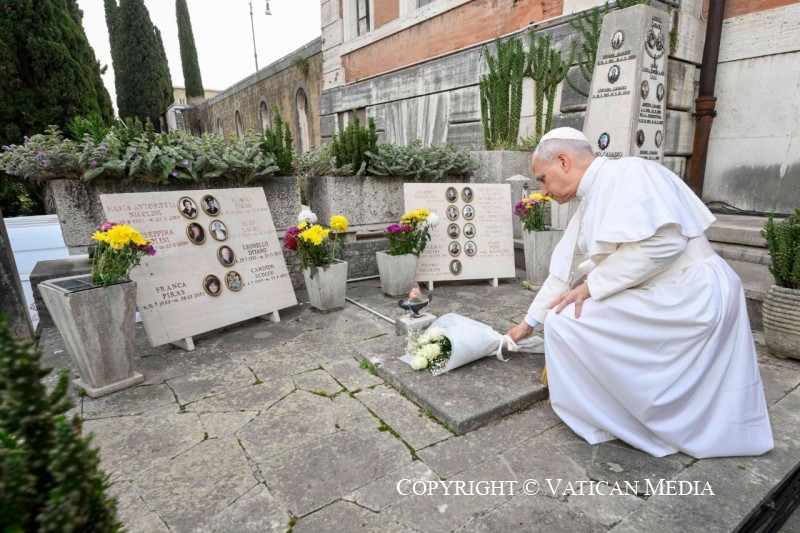 Chers frères et sœurs, alors que la douleur de l’absence de ceux qui ne sont plus parmi nous reste gravée dans nos cœurs, confions-nous à l’espérance qui ne déçoit pas (Cf. Rm 5, 5) ; regardons le Christ ressuscité et pensons à nos chers défunts comme enveloppés de sa lumière ; laissons résonner en nous la promesse de la vie éternelle que le Seigneur nous adresse. Il éliminera la mort pour toujours. Il l’a vaincue à jamais en ouvrant un passage vers la vie éternelle – c’est-à-dire en célébrant Pâques – dans le tunnel de la mort, afin que, unis à Lui, nous puissions y entrer et le traverser.