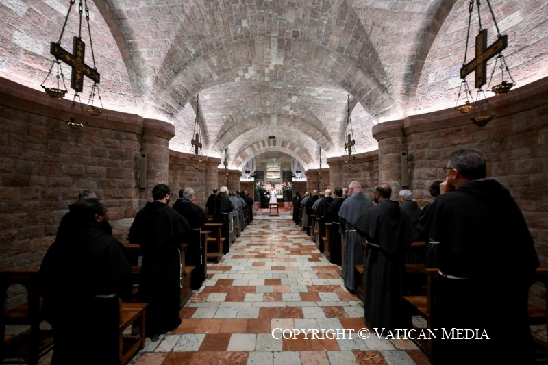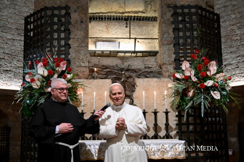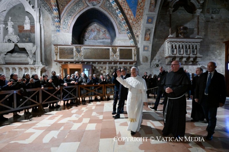 ASSISE (PG), 20 novembre – Ce matin, Sa Sainteté le pape Léon XIV a effectué une visite privée à la tombe de saint François. Le Saint-Père s’est arrêté pour un moment de prière silencieuse devant le sépulcre. La visite, vécue dans un climat de recueillement, s’est déroulée en présence de la communauté des frères du Sacré Couvent, réunis en prière avec lui.