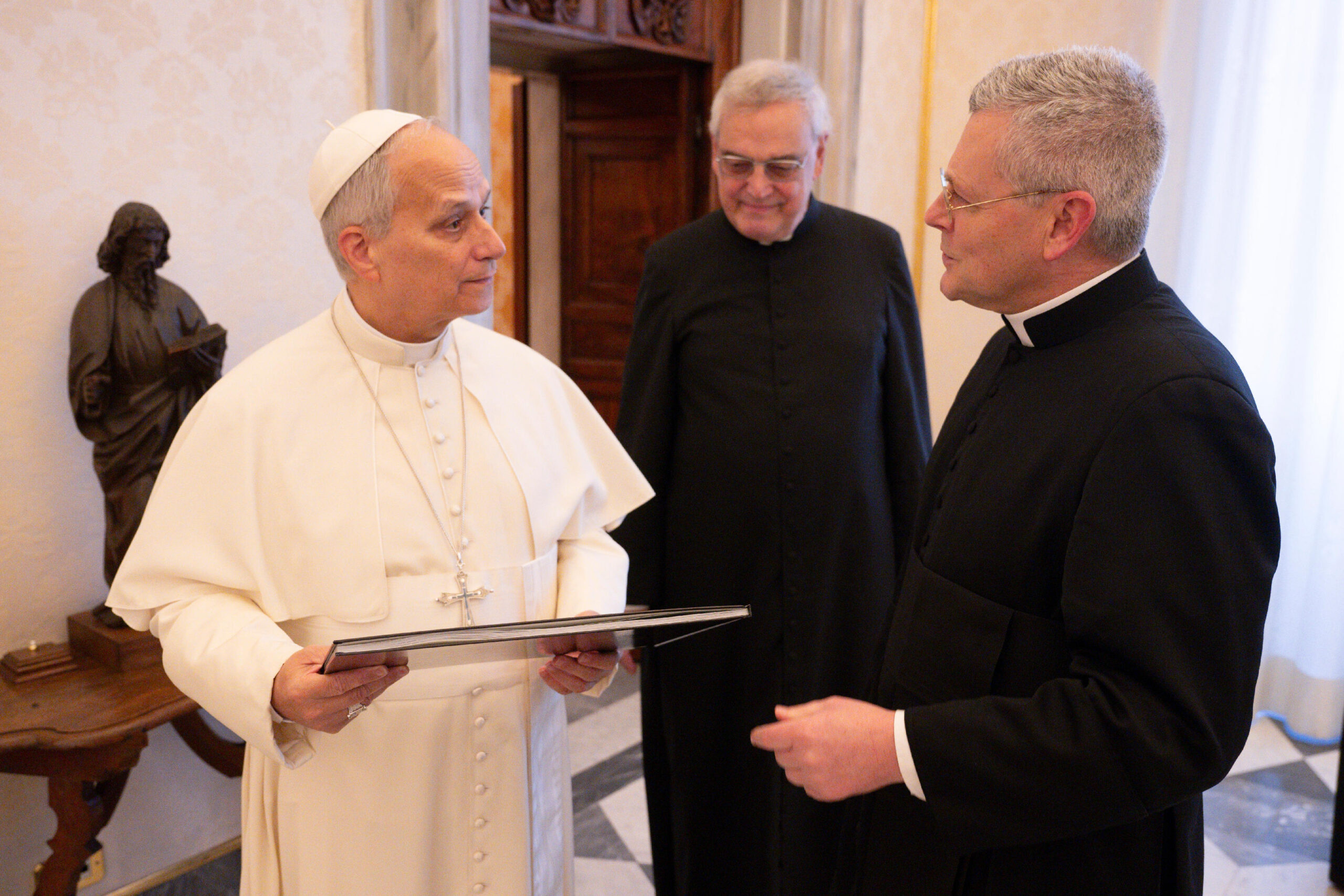 Cette cordiale rencontre d'une demi-heure a été l'occasion de présenter plus en détail au Saint-Père la fondation et l'histoire de la Fraternité © Vatican MediaÀ la demande du Supérieur général de la Fraternité sacerdotale Saint-Pierre, le pape Léon XIV a reçu en audience privée au Vatican, le lundi 19 janvier 2026, l’abbé John Berg. Il était accompagné de l’abbé Josef Bisig, l’un des fondateurs de la Fraternité, ancien Supérieur général et actuel recteur du séminaire Notre-Dame-de-Guadalupe à Denton, aux États-Unis.