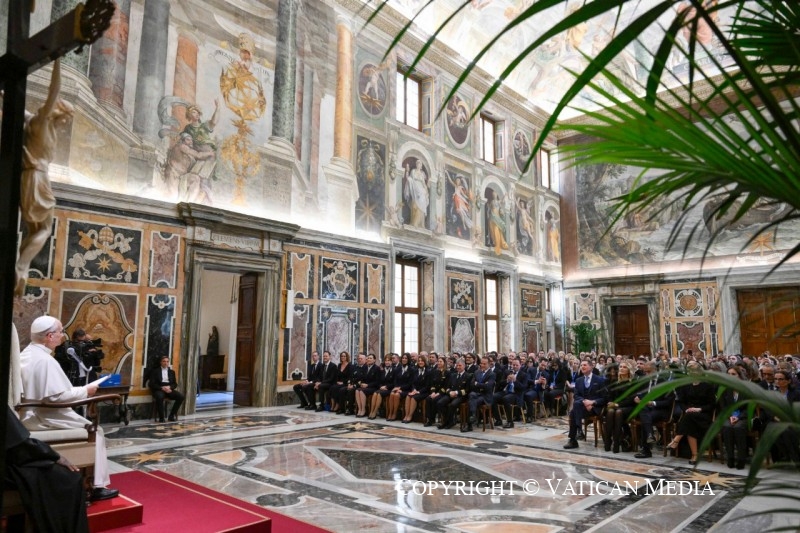Le lundi 23 mars 2026, dans la salle Clémentine, le Saint-Père a rencontré les dirigeants et le personnel de la compagnie aérienne nationale ITA Airways et ainsi qu’une délégation du groupe Lufthansa pour souligner l’importance des vols papaux comme symboles de dialogue, de service et de paix dans le monde contemporain.