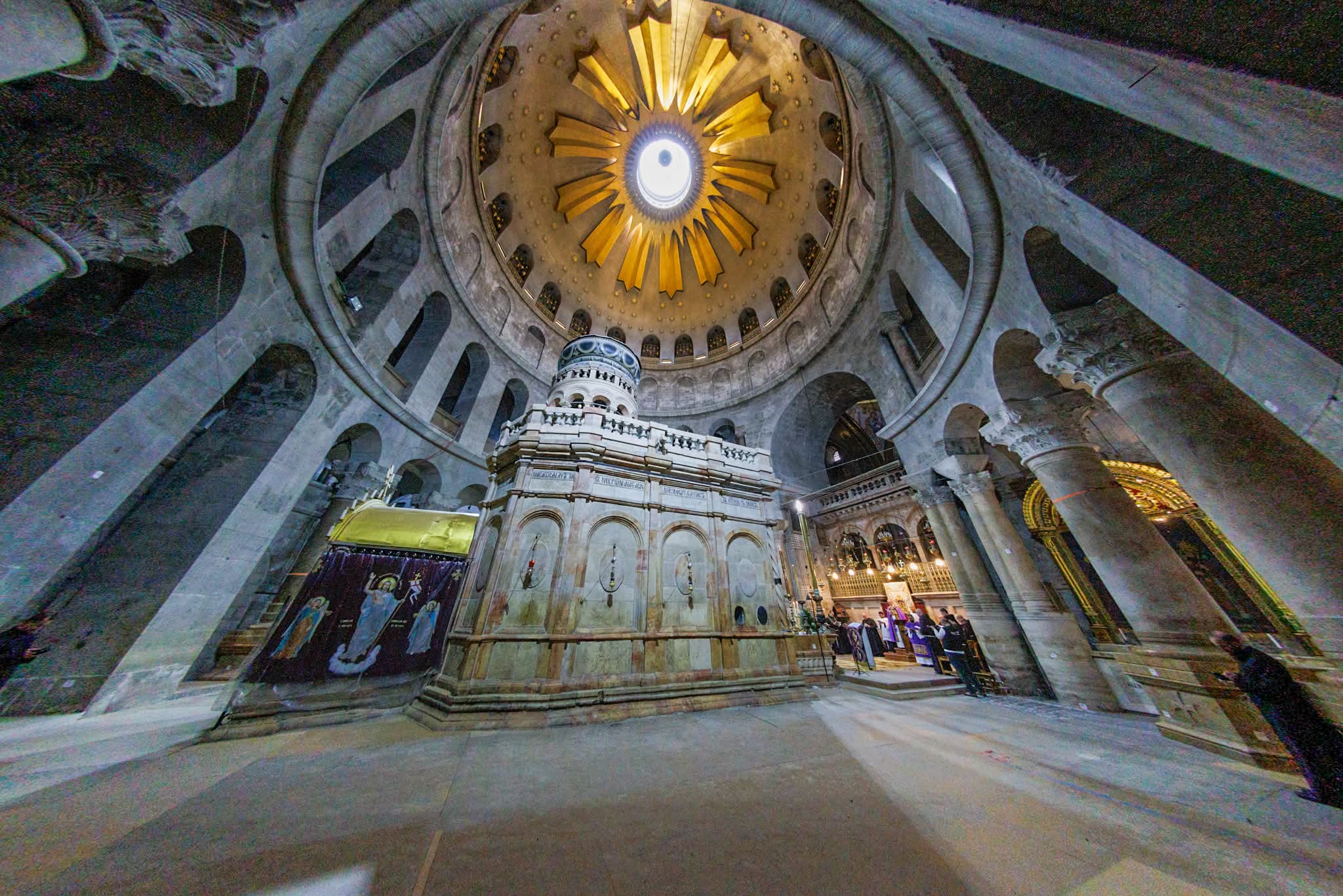 Cette tradition, conservée au fil des siècles, naît de la nécessité de respecter les horaires historiquement accordés à l’Église latine pour célébrer devant la Tombe du Christ, au cœur de la Basilique du Saint-Sépulcre.
