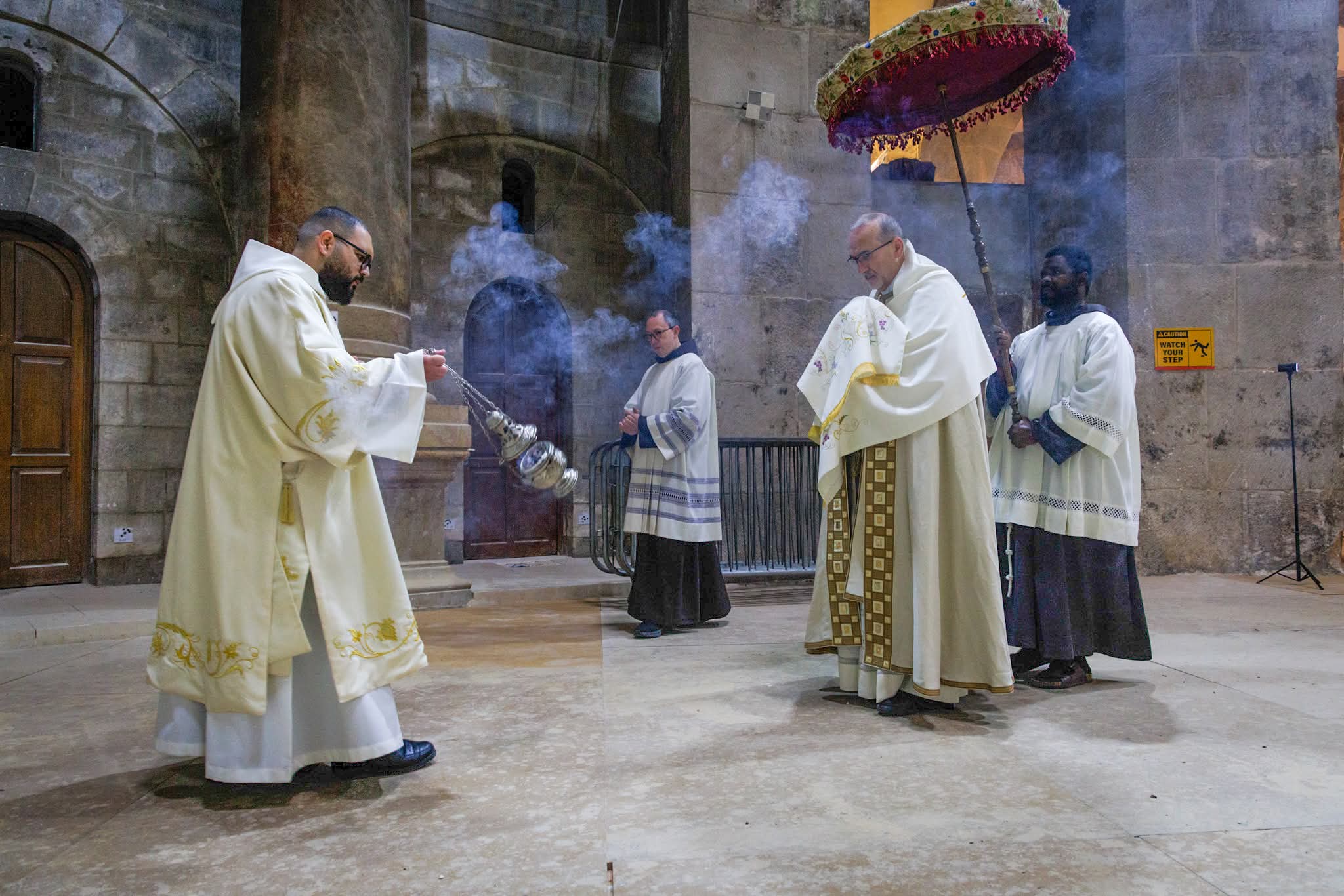 C’est dans ce contexte que, chaque année, les Frères de la Custodie de Terre Sainte accompagnent et introduisent le Patriarche Latin de Jérusalem, le cardinal Pierbattista Pizzaballa, appelé à présider la célébration. À l’entrée du Saint-Sépulcre, le Président du lieu Frère Giuseppe Gaffurini l’a accueilli comme le prévoit le Status Quo.