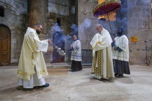 L’accès à la Basilique a été fortement limité, seuls le Patriarche et quatre religieux ont pu entrer et prendre part à la célébration, s’unissant aux Frères qui vivent au Saint-Sépulcre et qui ont célébré seulement la Messe in Cœna Domini.