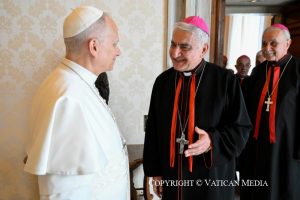 Permettez-moi encore quelques rappels à la fois fraternels et paternels. Je vous recommande d’être attentifs et transparents dans l’administration des biens, sobres, mesurés et responsables dans l’usage des médias, prudents dans vos déclarations publiques, afin que chaque parole et chaque comportement contribuent à édifier — et non à blesser — la communion ecclésiale et le témoignage de l’Église. Ayez à cœur la formation des prêtres, vos premiers collaborateurs dans le ministère : soutenez-les par votre proximité, en édifiant avec eux et pour eux une fraternité concrète et tangible. Et aidez, avant tout par l’exemple, les personnes consacrées à garder les dons ineffables de l’obéissance et de la chasteté. Accompagnez les fidèles laïcs, en leur apportant une attention pastorale, afin qu’ils se sentent encouragés, malgré toutes les épreuves, à rester fermes dans la foi reçue des Pères et à demeurer sur leurs terres. Cela est important pour toute l’Église, car les régions où a jailli la lumière de la foi – orientale lumen – ne peuvent se passer des croyants en Jésus, des chrétiens, qui sont au Moyen-Orient comme les étoiles au ciel. Q