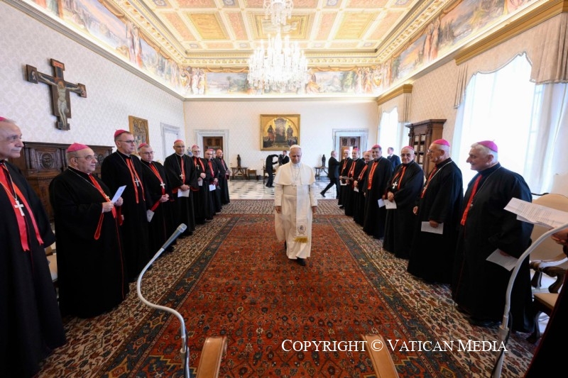 Permettez-moi encore quelques rappels à la fois fraternels et paternels. Je vous recommande d’être attentifs et transparents dans l’administration des biens, sobres, mesurés et responsables dans l’usage des médias, prudents dans vos déclarations publiques, afin que chaque parole et chaque comportement contribuent à édifier — et non à blesser — la communion ecclésiale et le témoignage de l’Église. Ayez à cœur la formation des prêtres, vos premiers collaborateurs dans le ministère : soutenez-les par votre proximité, en édifiant avec eux et pour eux une fraternité concrète et tangible. Et aidez, avant tout par l’exemple, les personnes consacrées à garder les dons ineffables de l’obéissance et de la chasteté. Accompagnez les fidèles laïcs, en leur apportant une attention pastorale, afin qu’ils se sentent encouragés, malgré toutes les épreuves, à rester fermes dans la foi reçue des Pères et à demeurer sur leurs terres. Cela est important pour toute l’Église, car les régions où a jailli la lumière de la foi – orientale lumen – ne peuvent se passer des croyants en Jésus, des chrétiens, qui sont au Moyen-Orient comme les étoiles au ciel. Q
