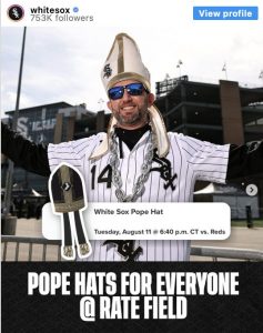 Le 11 août prochain, lors d’un match à domicile contre les Reds de Cincinnati, les White Sox distribueront aux supporters présents une coiffe en édition limitée inspirée de la mitre papale. Initialement conçue comme un article promotionnel lié à certains forfaits de billets, l’initiative a été étendue face à la forte demande et est désormais offerte à tous les spectateurs entrant dans le stade. La coiffe elle-même — noire et or, ornée du logo de l’équipe — transpose l’un des symboles les plus reconnaissables de l’autorité ecclésiastique dans le langage du merchandising sportif.